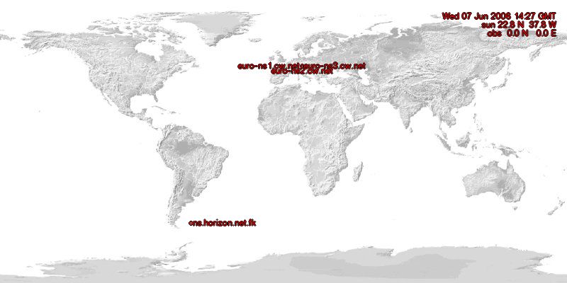 Using the NetGeo-tools from CAIDA and Xplanet to make a guess where the nameservers of all TLDs are located.