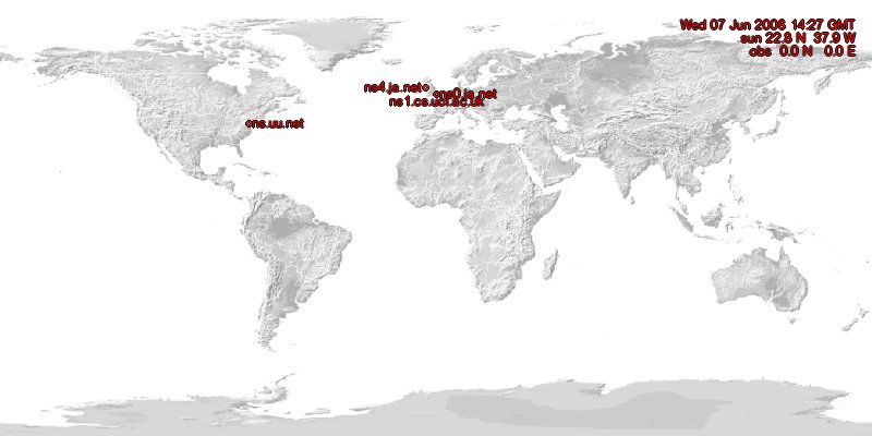 Using the NetGeo-tools from CAIDA and Xplanet to make a guess where the nameservers of all TLDs are located.