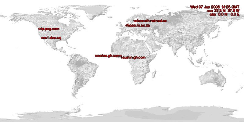 Using the NetGeo-tools from CAIDA and Xplanet to make a guess where the nameservers of all TLDs are located.