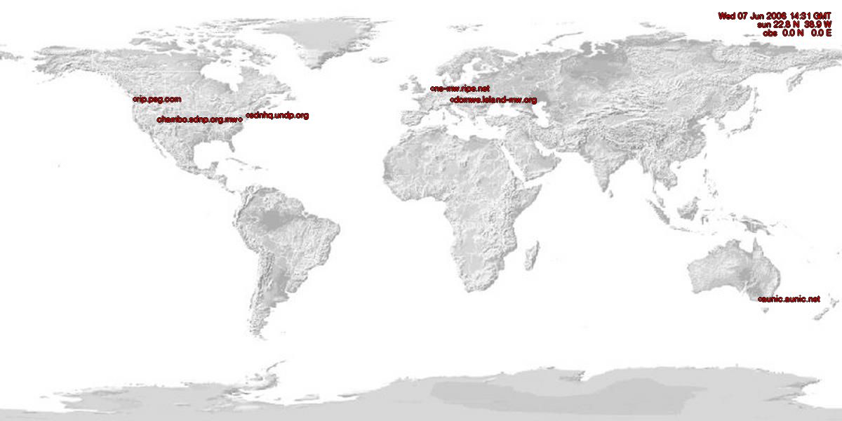 Using the NetGeo-tools from CAIDA and Xplanet to make a guess where the nameservers of all TLDs are located.